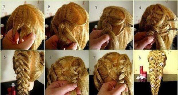 2. Левую прядь кладем под центральную предварительно добавив к ней подхват. От правой пряди отделяем тонкую прядку, добавляем подхват и проводим также под центральной прядью.