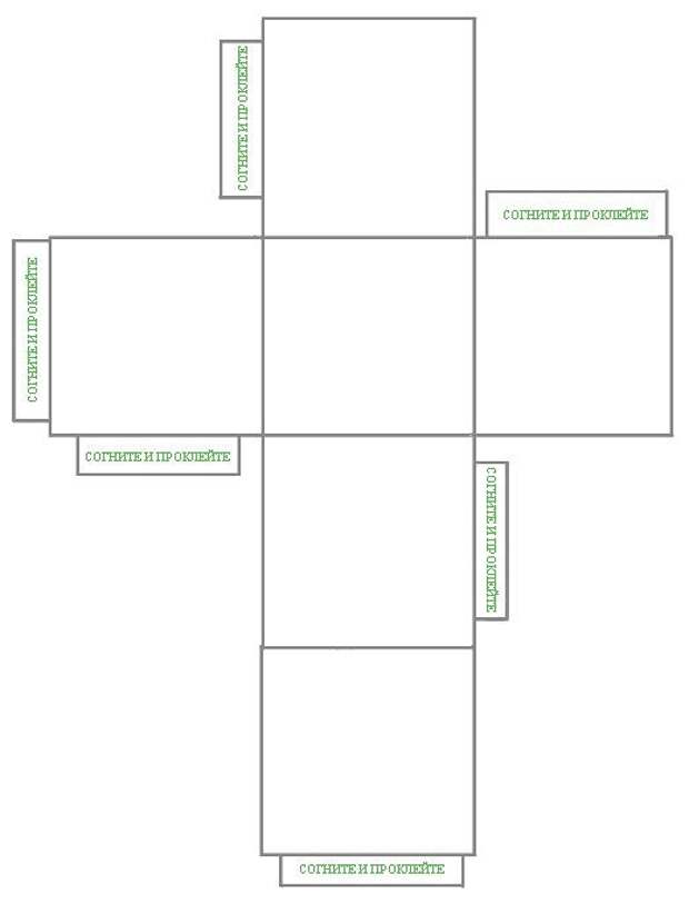 Фотокубик можно сделать двумя способами: обклеить квадратными фотографиями реальный кубик (из детского конструктора, кубик Рубика) или склеить прямо из бумаги или фотографий. Для это в фотошопе надо нарисовать вот такую раскладку, разместить на ней фотографии (продумайте, где будут «верх» и «низ» кубика) и распечатать в фотомастерской.