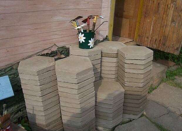 В дождливую погоду лучше не заливать плитку потому, что долго сохнут и от дождя их приходится чем нибудь накрывать. В день для замеса 15-ти плиток уходит 2,5 часа.