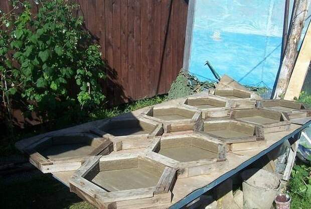 Формочки можно придумать любой формы. Здесь формочки изготовлены из обрезков бруса 5 см х 5 см и тонких реек (распиленных на станке). Эти бруски сколочены обычными гвоздями и сверху закреплены рейками для жёсткости (т.е. чтобы покрепче). Формочки существуют уже 8 лет и не поломались.